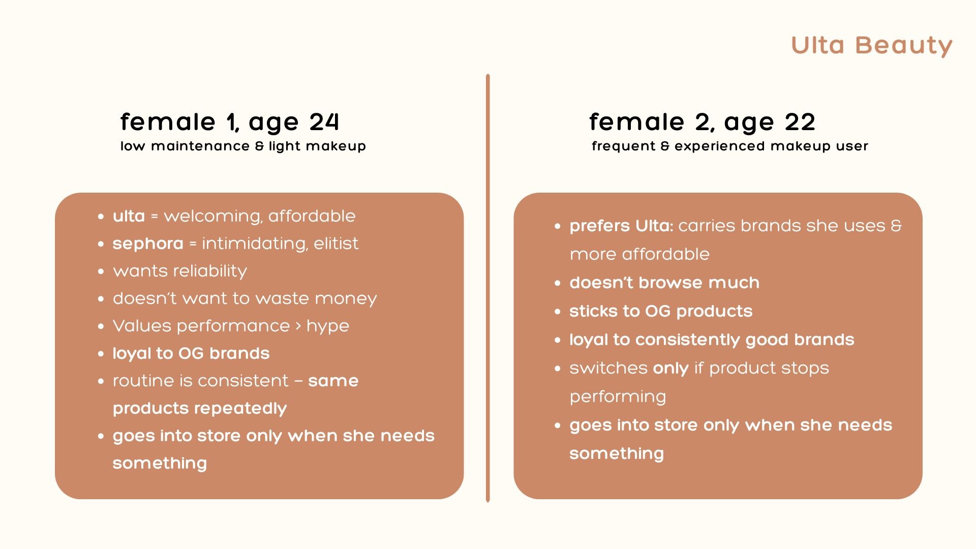 To better understand how people navigate beauty retail environments, I conducted shop-along research with multiple shoppers at Ulta and Sephora. While each shopper expressed different frustrations with specific retailers, a consistent pattern emerged: the overwhelming number of products, brands, and recommendations made it difficult for shoppers to feel confident in their decisions. Many spent time scanning shelves, comparing options, or second-guessing purchases rather than enjoying the experience.